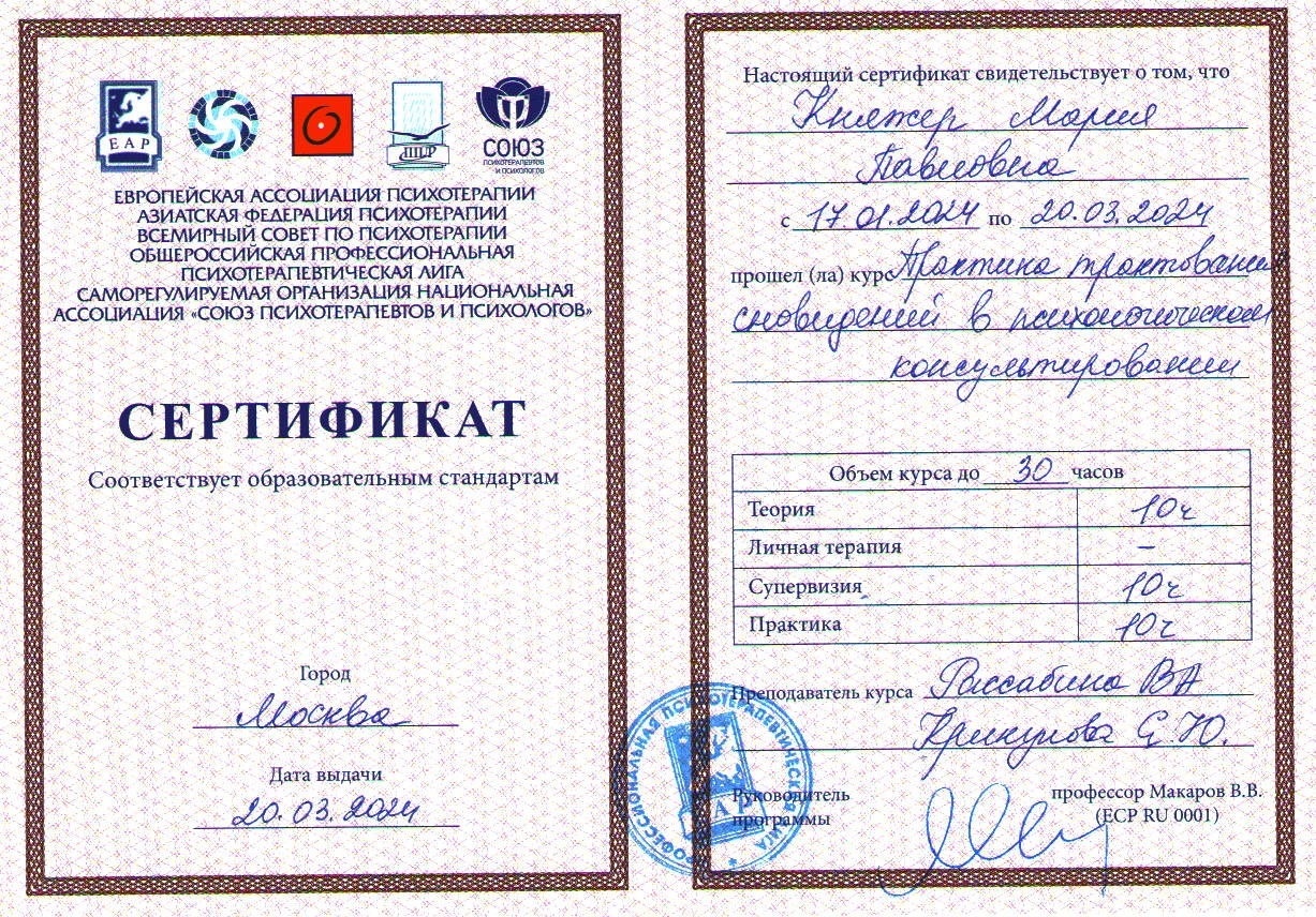 При отмене встречи менее, чем за 24 часа, оплата за несостоявшуюся сессию взимается полностью.